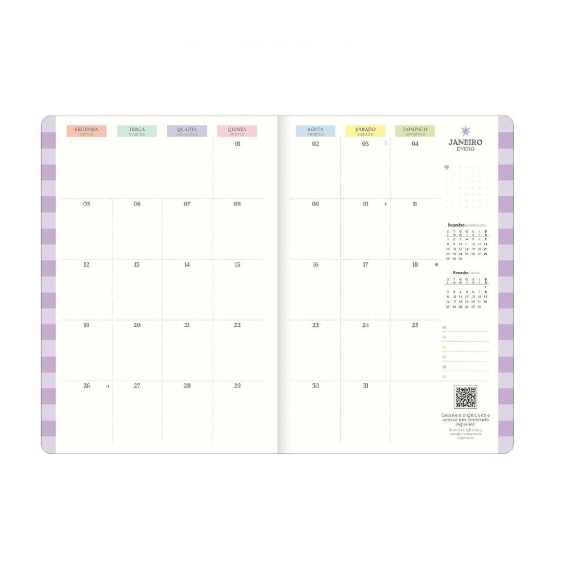 Este planner, que possui 20 folhas em papel creme, com gramatura de 90 g/m², e conteúdo temático em QR Code, é escolha ideal para anotações objetivas de tarefas e compromissos.
