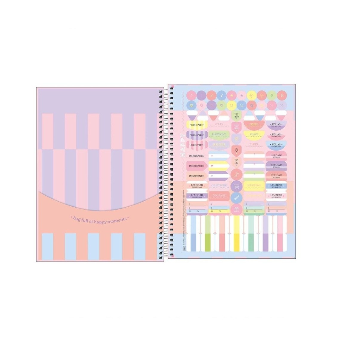 O Caderno Espiral Capa Dura Universitário 1 Matéria Happy 80 Folhas possui capa dura com a parte interna decorada, bolsa plástica para guardar trabalhos e anotações, folha com adesivos funcionais, folhas pautadas decoradas e espiral colorido. Ideal para o dia a dia na escola ou na faculdade.
